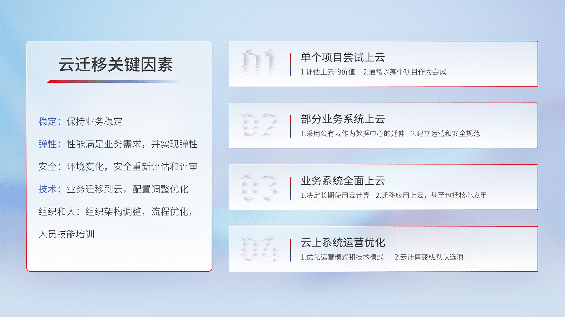 结合实际业务,,,从规划设计、、、、云平台选型、、云原生改造、、、数据迁移、、、集成交付,,,迁移全过程为客户识别最佳上云路径,,做好风险识别管理,,设计网络架构、、、身份权限、、安全审计合规、、操作审计、、日志审计、、监控告警策略、、、、多站点容灾设计等,,对云上基础设施进行整体规划,,提升IT治理水平,,,,以满足弹性、、高可用、、、高性能的需求。。