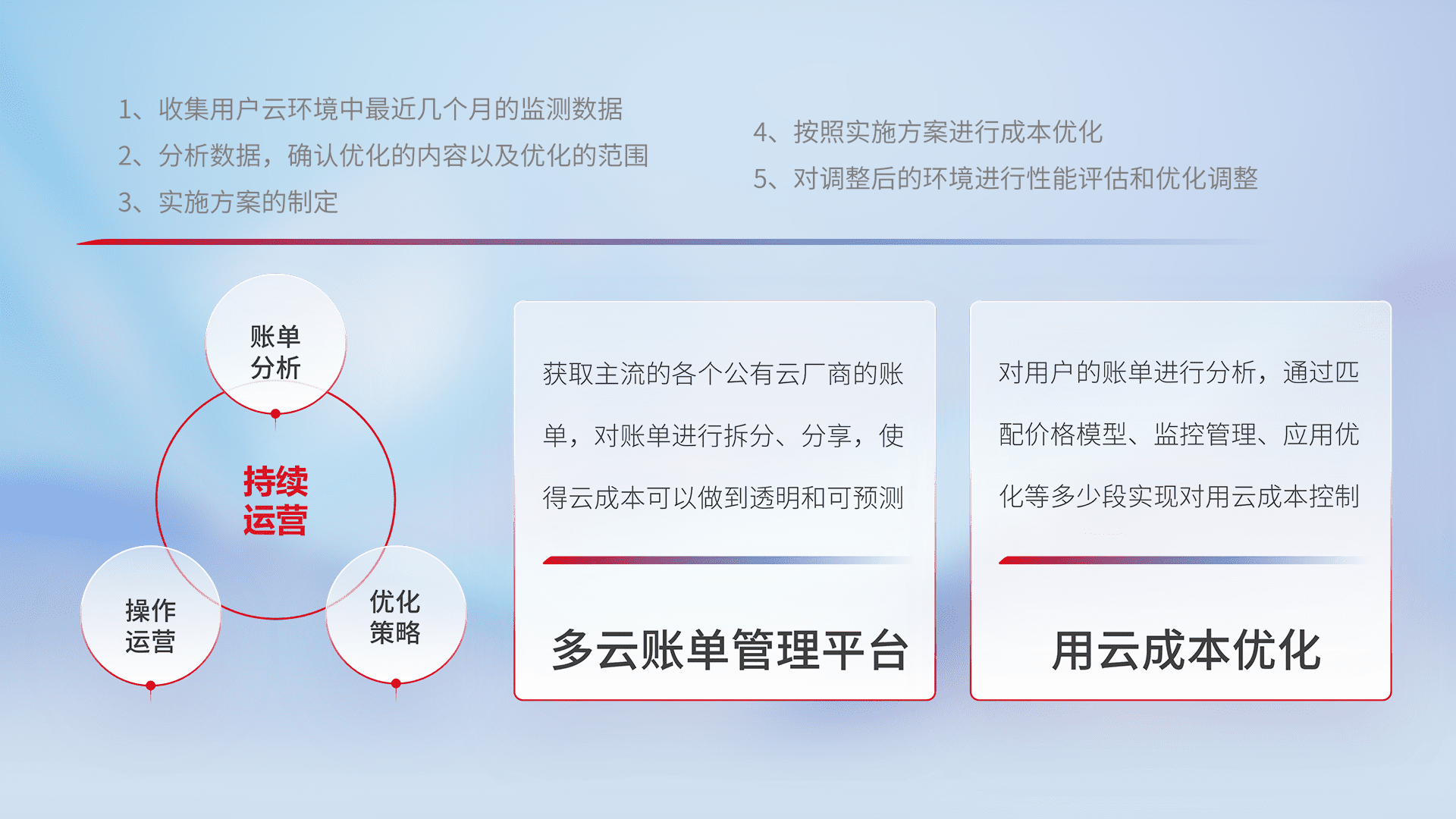 通过多云纳管,,,以统一的资源数据模型把客户的云资源进行抽象和封装,,,进而实现对多云资源的统一操作,,,保障云资源管理的可靠性、、、稳定性与可用性。。。。量身定制化运维内容,,,配置、、、、开发运维、、补丁管理、、、、备份、、、监控、、、、认证和访问管理、、审计和日常巡检等,,保障在用云过程中的可靠度,,,,稳定度以及高可用率。。