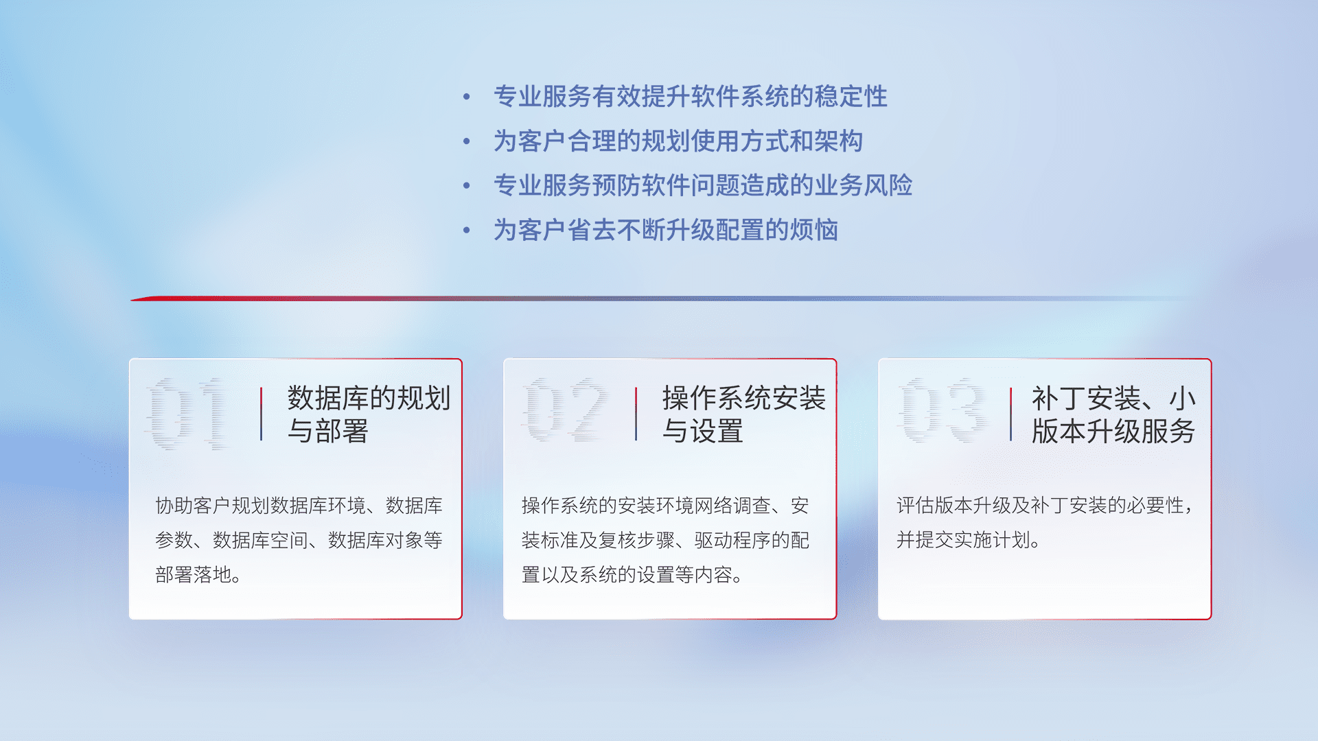 为客户提供软件规模升级、、、、快速部署、、、、按需配置的专业服务,,,从数据库的规划与部署到操作系统的安装与设置,,再到补丁安装和小版本升级提供支持。。。